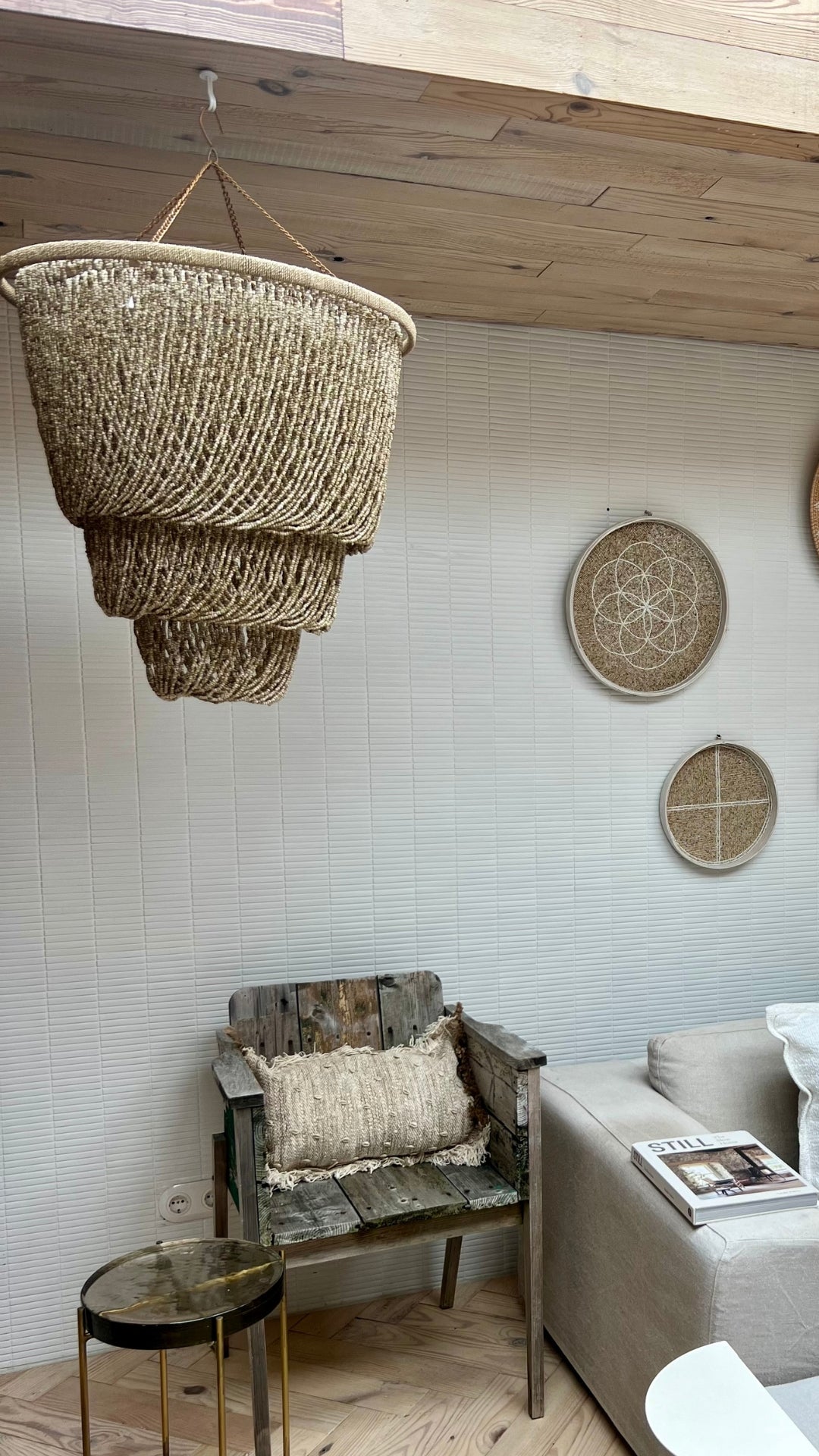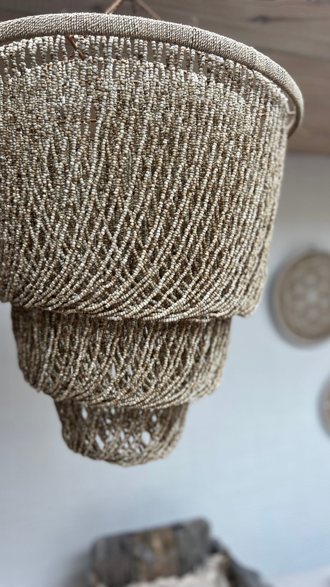 Illuminate your space with elegance and artistry with our handmade white beaded hanging lamp. The chandelier is 80 cm long by 50 cm wide. The lamp is meticulously crafted, featuring an intricate design of white beads that creates a stunning visual impact. Perfect for adding a touch of bohemian charm or a chic accent to any room, this unique piece brings warmth and sophistication to your home decor.