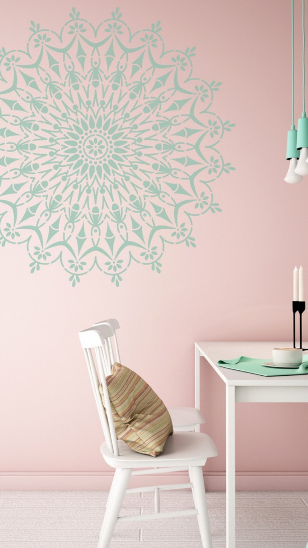 The only thing you need besides the stencil is 0.25 liters of water-based paint and a way to apply the stencil. You can also opt for two Flexa testers, which are exactly enough for the mandala. Visit our how to apply page to explore how to make a Mandala using the Mandala Stencil.
