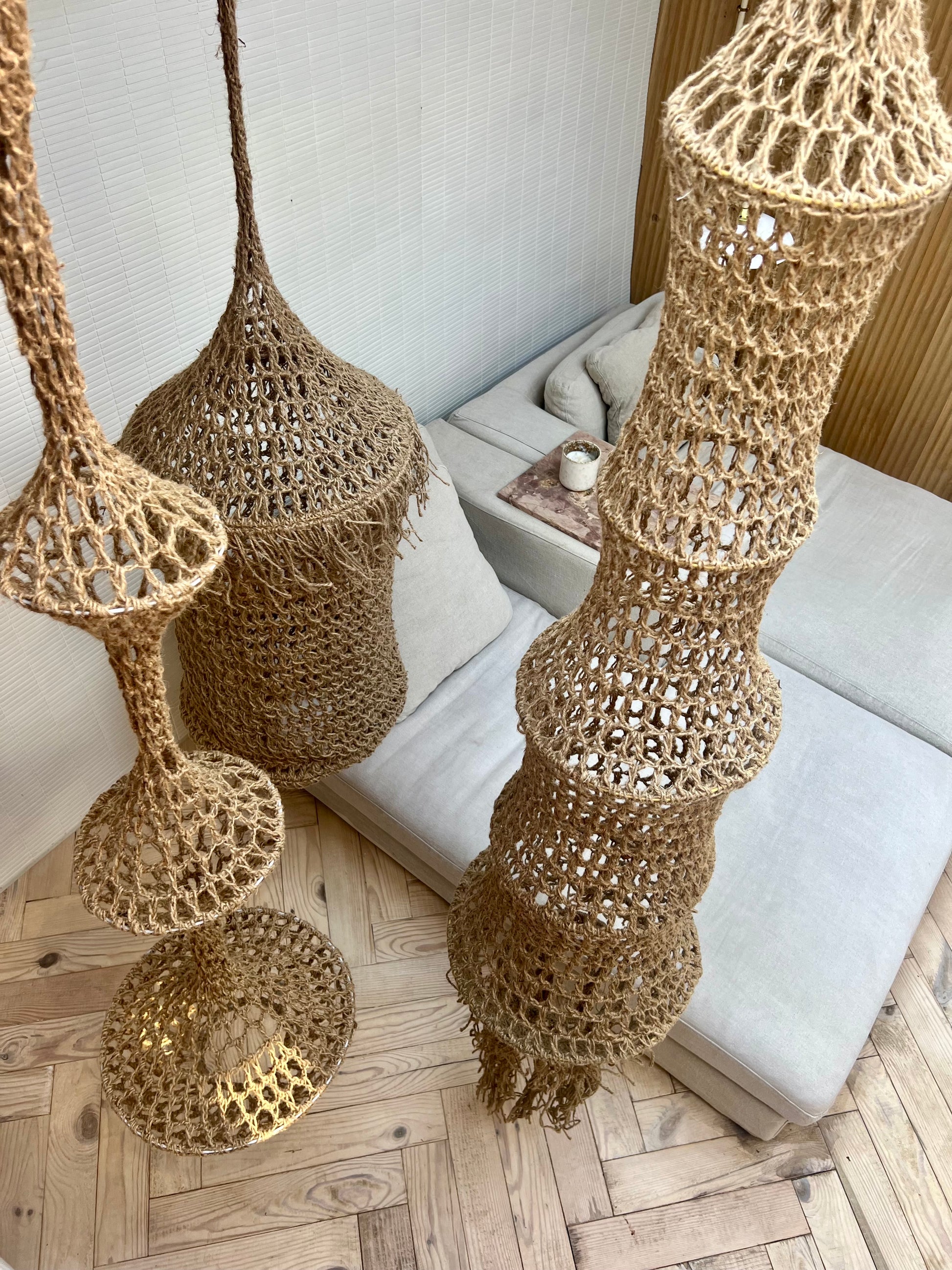 Add a statement of texture and artistry to your space with this Handmade Crochet Hanging Sculpture, meticulously crafted from natural fiber and standing an impressive 2 meters tall. This elongated, tower-like piece blends intricate crochet work with organic materials, forming a flowing, architectural silhouette that brings warmth and movement to any interior.