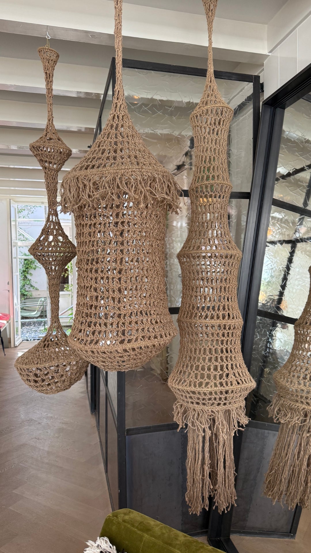 Add a statement of texture and artistry to your space with this Handmade Crochet Hanging Sculpture, meticulously crafted from natural fiber and standing an impressive 2 meters tall. This elongated, tower-like piece blends intricate crochet work with organic materials, forming a flowing, architectural silhouette that brings warmth and movement to any interior.
