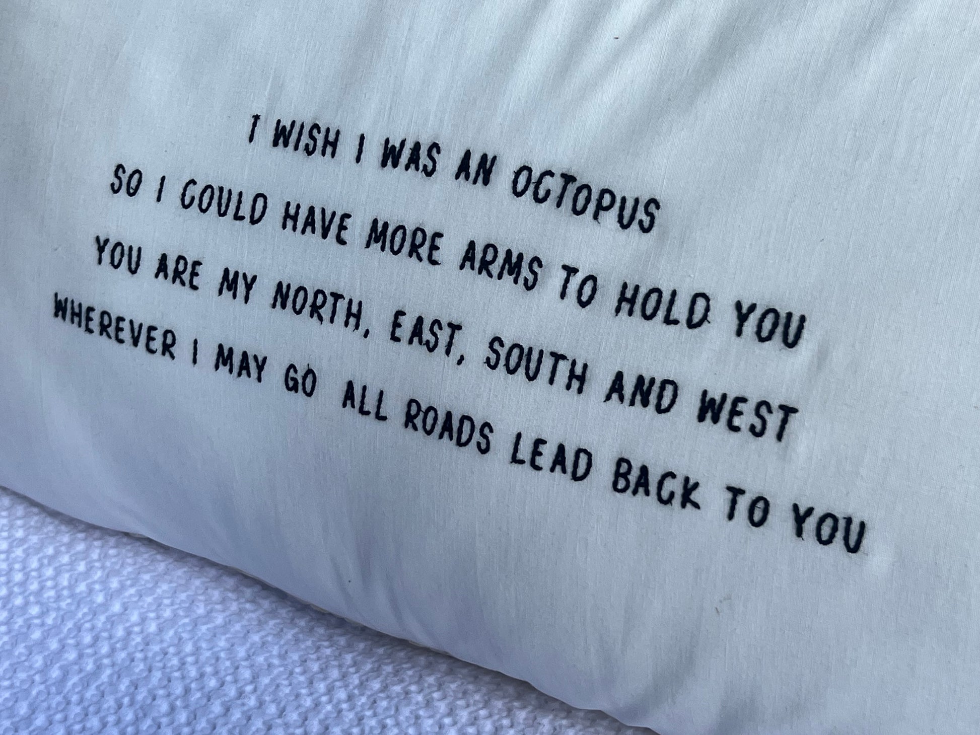 Discover the beauty of unique craftsmanship with our handmade linen pillows, each a one-of-a-kind creation. Measuring a generous 90 x 50 cm, these exquisite pillows feature hand-embroidered text, lovingly crafted by skilled women artisans.