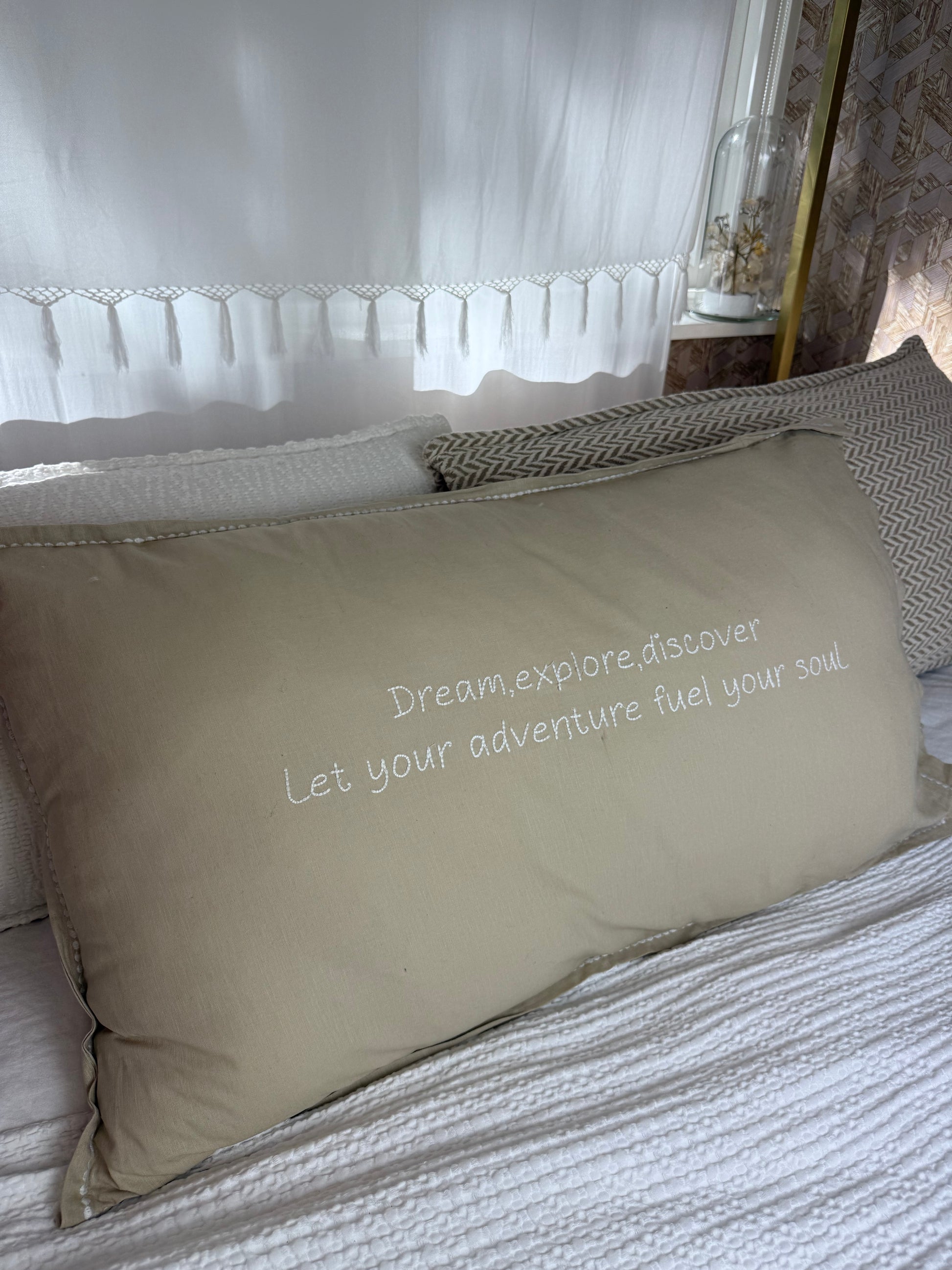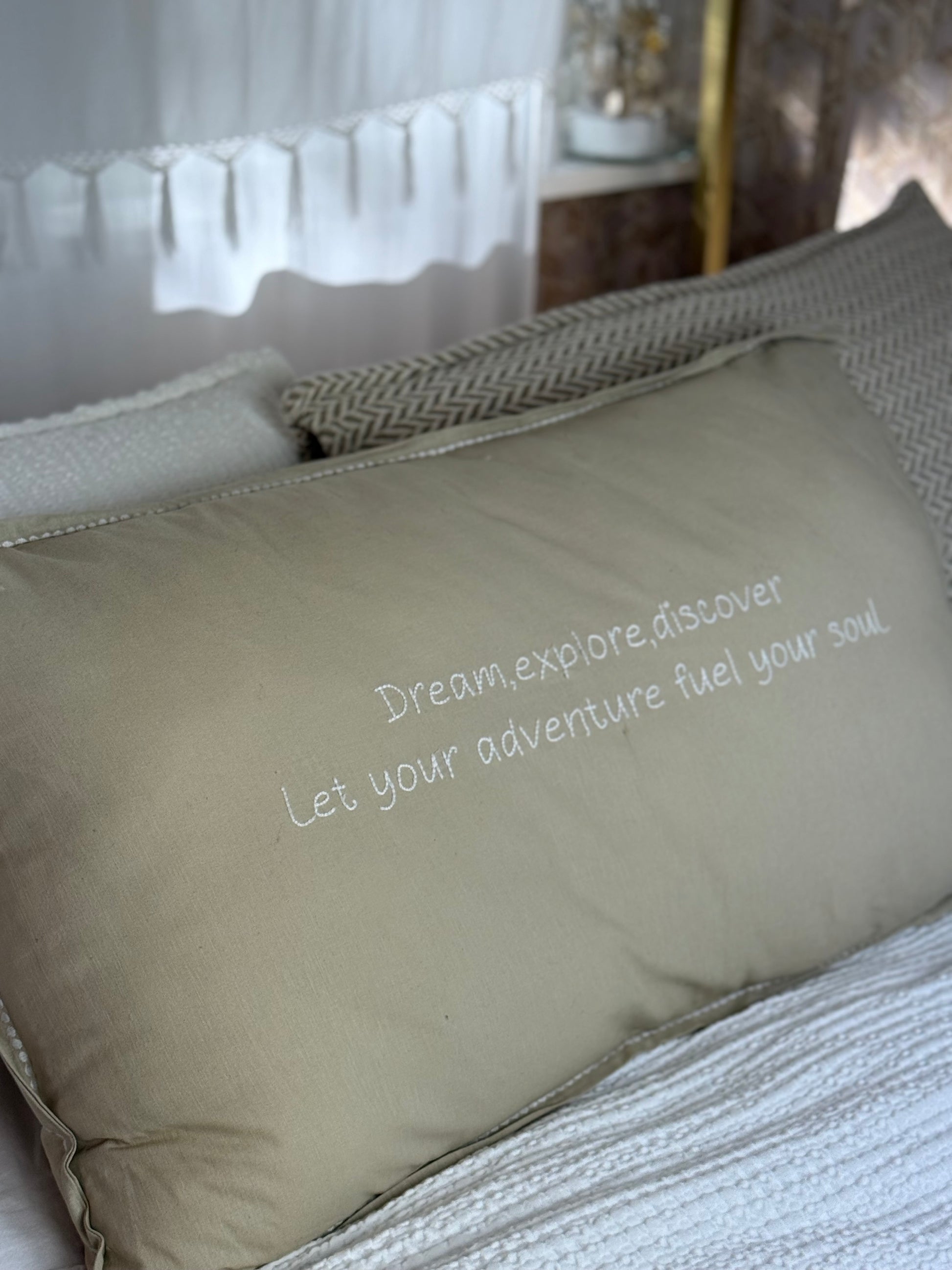 Discover the beauty of unique craftsmanship with our handmade linen pillows, each a one-of-a-kind creation. Measuring a generous 90 x 50 cm, these exquisite pillows feature hand-embroidered text, lovingly crafted by skilled women artisans.