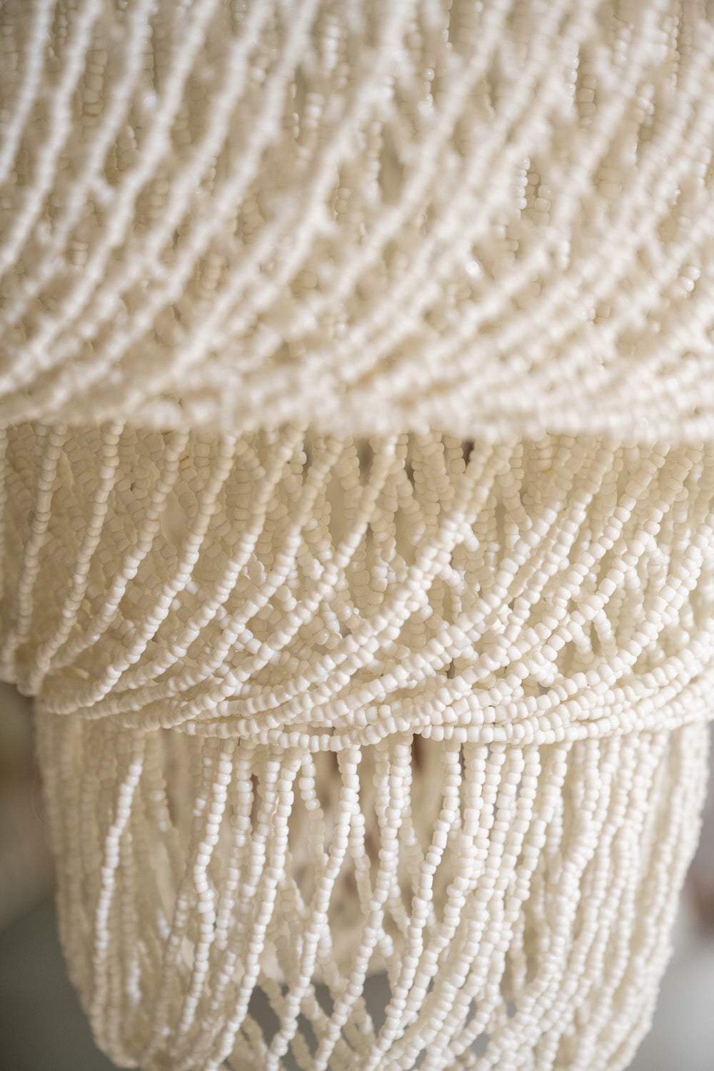 Illuminate your space with elegance and artistry with our handmade white beaded hanging lamp. The chandelier is 80 cm long by 50 cm wide. The lamp is meticulously crafted, featuring an intricate design of white beads that creates a stunning visual impact. Perfect for adding a touch of bohemian charm or a chic accent to any room, this unique piece brings warmth and sophistication to your home decor.