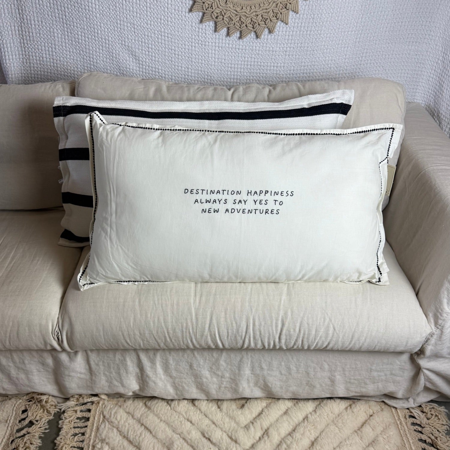 Discover the beauty of unique craftsmanship with our handmade linen pillows, each a one-of-a-kind creation. Measuring a generous 90 x 50 cm, these exquisite pillows feature hand-embroidered text, lovingly crafted by skilled women artisans.