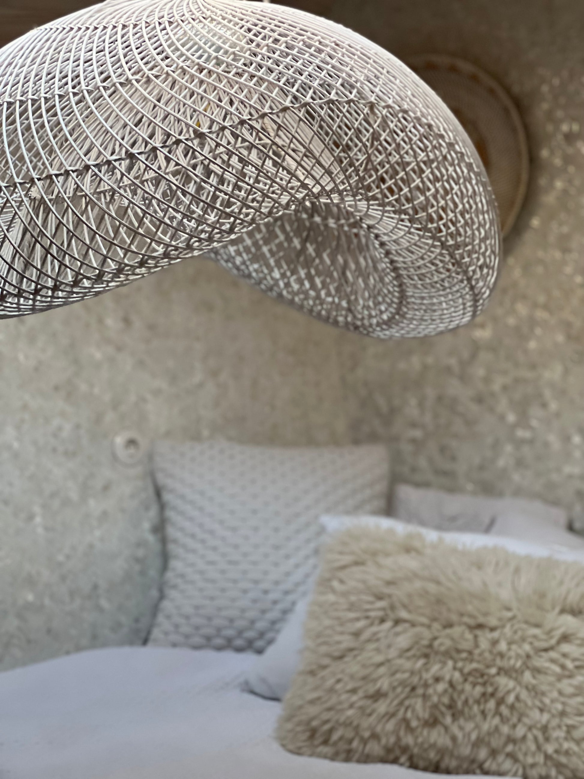 The combination of the natural look of rattan with the playful shape of a cloud looks amazing above a dining table and gives a beautiful light through the rattan in the evening.