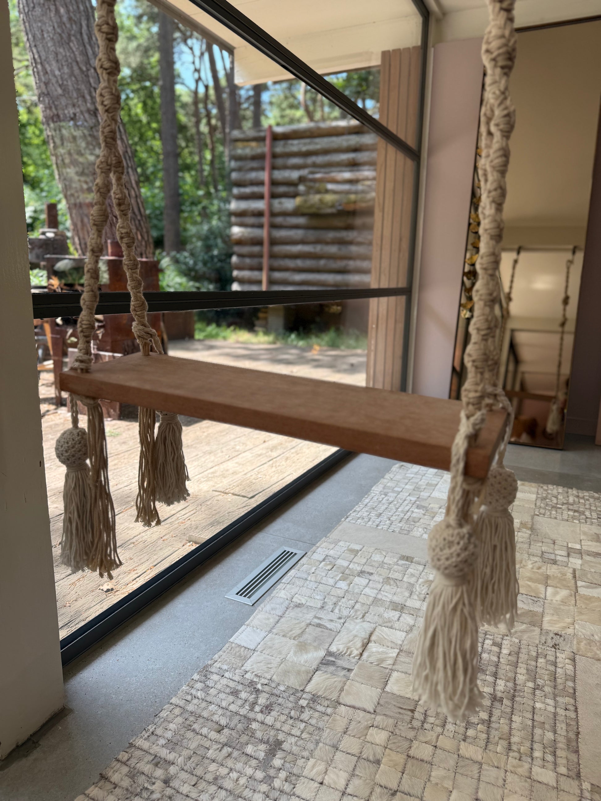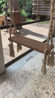Bring a dreamy bohemian vibe into your space with this handmade swing. Crafted from solid wood and beautifully finished with intricate macramé — knotted by skilled women artisans. The twisted cotton ropes and fringe detail add a playful yet elegant touch.