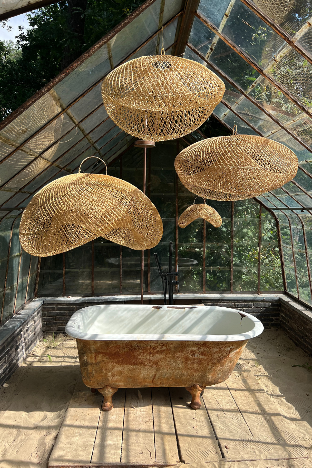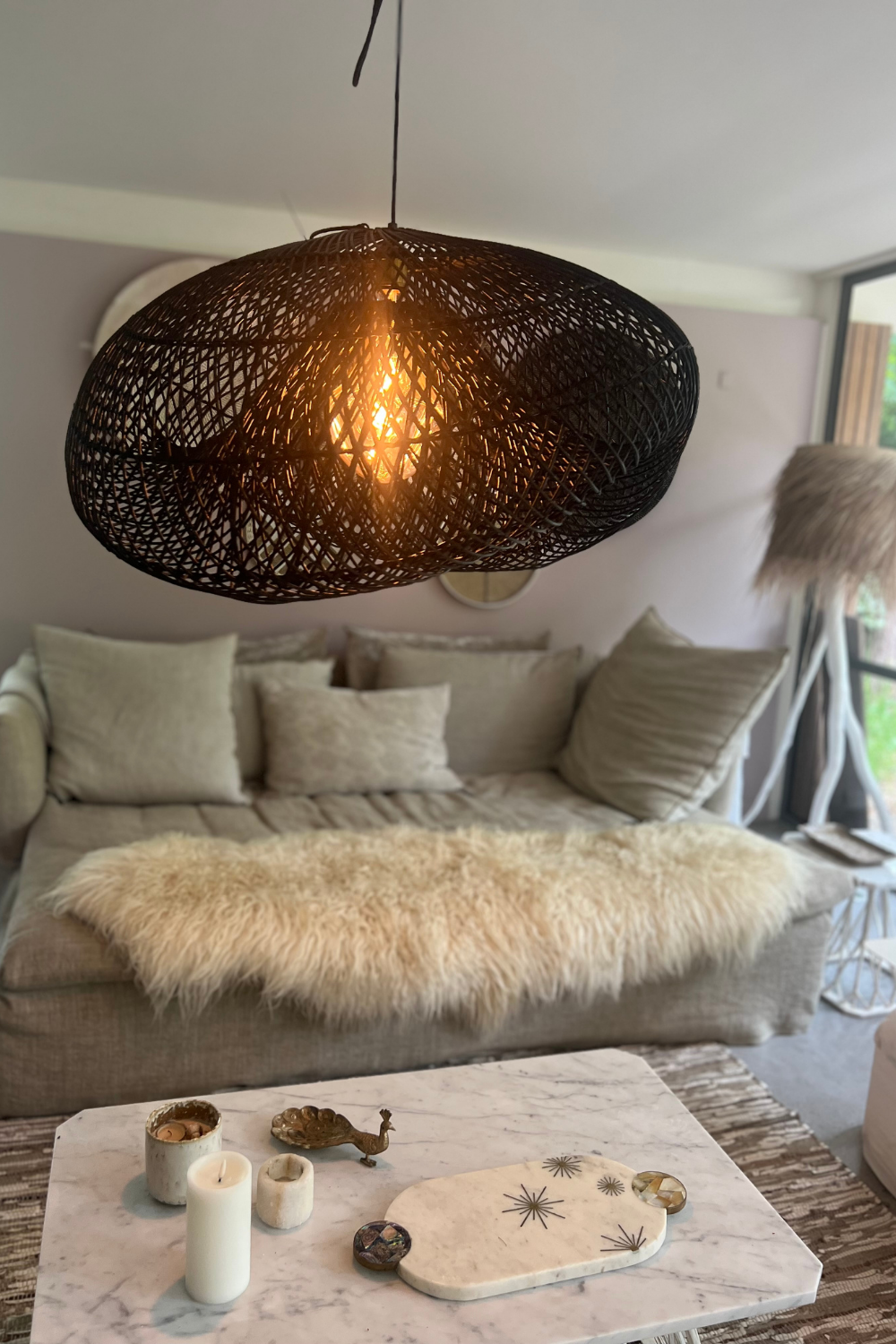The combination of the natural look of rattan with the playful shape of a cloud looks amazing above a dining table and gives a beautiful light through the rattan in the evening.